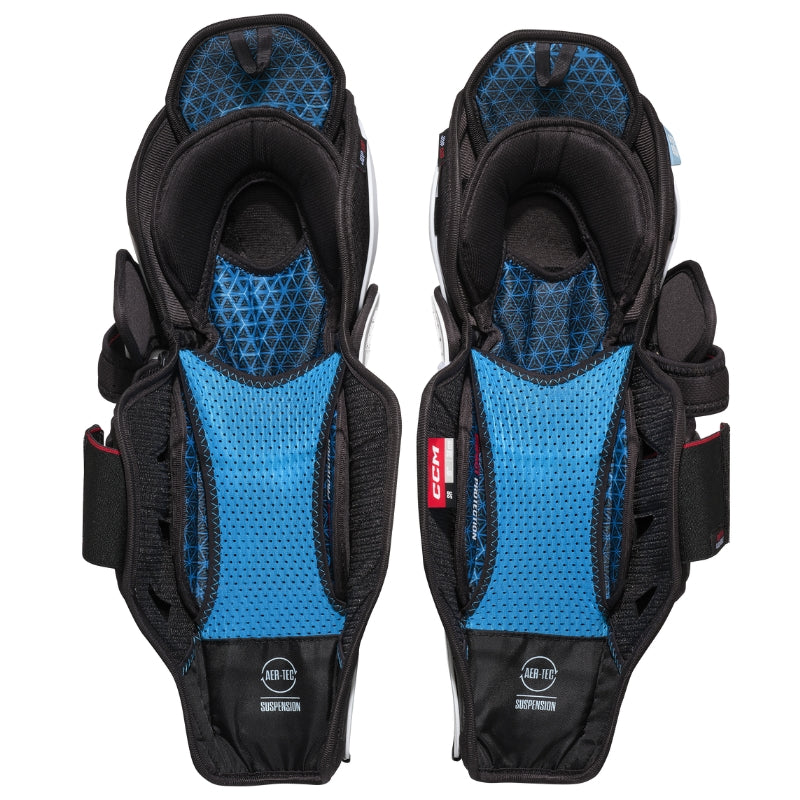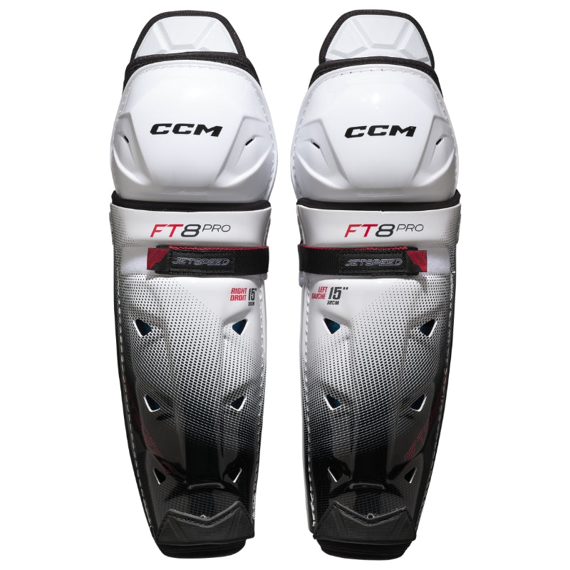 The CCM Jetspeed FT8 Pro Hockey Shin Guards - Senior (2025) deliver elite protection and agility with a tapered anatomical fit for unrestricted motion. Featuring the AER-TEC thermoregulation system for maximum airflow and cooling, plus JDP kneecap technology to disperse impact away from the knee joint. ZOTEFOAM-lined shin caps and compress-molded HD foam provide pro-level impact resistance, while fully adjustable straps ensure a secure, customized fit for all calf sizes.